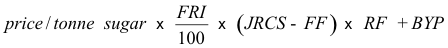 21. If the tonnage of 96° sugar produced by a factory is exactly equal to the JRCS, then the factory would be said to have recovered 100% of the Theoretically Recoverable Cane Sugar (TRCS). In other words, it would have an efficiency of Factory Recovery Index (FRI) of 100. In practice, this figure is normally between 80 and 94, and accounts for cane yard losses and general factory inefficiency. A standard FRI will be determined for the industry for all factories. Suppliers will then be paid at the standard FRI, regardless of the actual FRI recorded at an individual factory.JRCS = pol in cane x recovery after milling x recovery after pol loss in final molasses x 1.03= P(1.02 - 0.44F) (1 - F) (1 - 0.4F) (1.4 - 40/Q) 1.03= 1.03 P (1.02 - 1.73F) (1.4 - 40/Q)