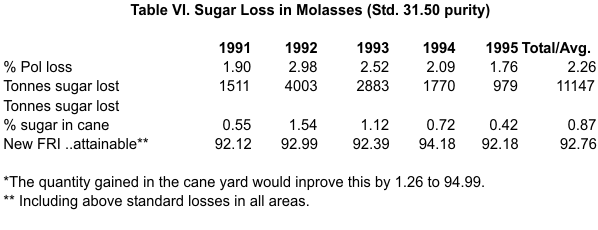 Sugar losses in molasses in 1995 were reduced by 743 tonnes below 1994 levels and continued a trend of reduction from previous years Table VI.