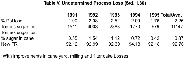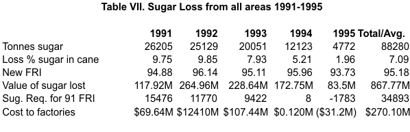 The total of 4772 tonnes sugar lost in 1995 was 18.21% of the 1991 level. This significant improvement was a result of better management in all areas, except perhaps milling. Over five years, some 88,280 tonnes valued at $867.77M were lost, equivalent to 7.09 units of FRI, Table VII.