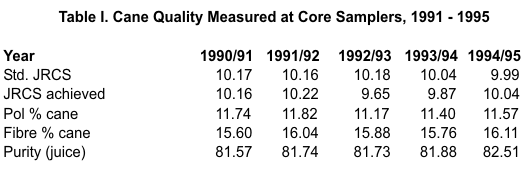 Once understood, the system quickly gained acceptance as both farmers and manufacturers recognized that progress was largely in their own hands. The serious producer saw at once that vastly increased levels of testing and timely availability of information were providing an instrument by which cane quality could be measured almost on a load by load basis. Compared with an average of some 10% of canes previously tested, core sampling sharply increased testing to 60% in the first year, rising to 76% by 1995. It is useful therefore at this stage to review five years’ experience of operating this system.