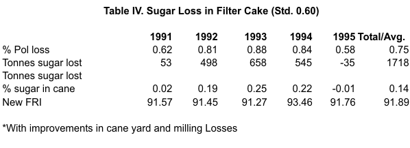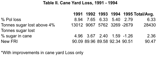 The standard for cane yard loss is set at 4%. Table II shows a reduction from 8.94% in 1991 to 2.79% in 1995. This could be viewed as a gain of 2,679 tonnes sugar in 1995.