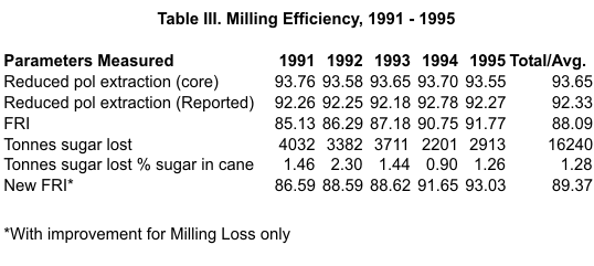 The target for milling efficiency depends on the fibre value. Despite being one of the Industry’s weakest areas, milling has improved with estimated sugar loss declining from 2.30 in 1992 to 0.90% in 1994 but inching up again to 1.26% in 1995, Table III.