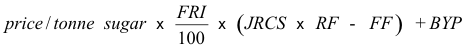 21. If the tonnage of 96° sugar produced by a factory is exactly equal to the JRCS, then the factory would be said to have recovered 100% of the Theoretically Recoverable Cane Sugar (TRCS). In other words, it would have an efficiency of Factory Recovery Index (FRI) of 100. In practice, this figure is normally between 80 and 94, and accounts for cane yard losses and general factory inefficiency. A standard FRI will be determined for the industry for all factories. Suppliers will then be paid at the standard FRI, regardless of the actual FRI recorded at an individual factory.JRCS = pol in cane x recovery after milling x recovery after pol loss in final molasses x 1.03= P(1.02 - 0.44F) (1 - F) (1 - 0.4F) (1.4 - 40/Q) 1.03= 1.03 P (1.02 - 1.73F) (1.4 - 40/Q)