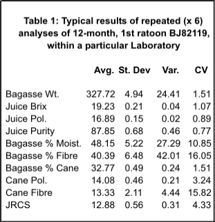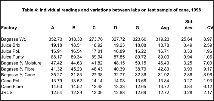 Tests include analyses of juice brix, pol and purity, bagasse quality and quantity, cane pol and % fibre, all towards determining the Jamaican recoverable cane sugar, or JRCS. In the tests within the labs, it is usual to find greater precision in determining juice than fibre data. Thus the CV for brix, pol, purity ranges between 0.77 and 1.07. But fibre analyses show a CV of 15.82% within the lab, Table 1. Where a number of labs are compared the CV falls ( to 5-12%), Tables 2-4, as the sample size increases by the number of participating labs and replications within the labs.